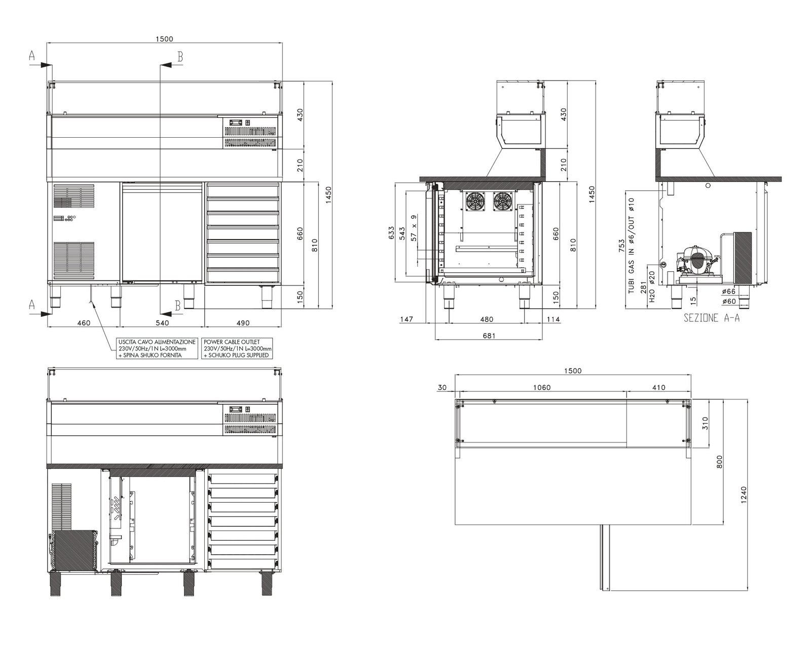 Nerezové prevedenie AISI304, granitová pracovná plocha, ventilové chladenie, kompresor vľavo, elektronická kontrolka teploty s digitálnym termostatom, elektrický odpor okolo rámu dverí aby sa vylúčila kondenzácia, automatické odmrazovanie zastavením kompresora, automatické odparovanie kondenzu, nastaviteľné nohy, 7 x neutrálna zásuvka na pizza cesto. Chladiaca vitrína so skleneným zákrytom a statickým chladením.