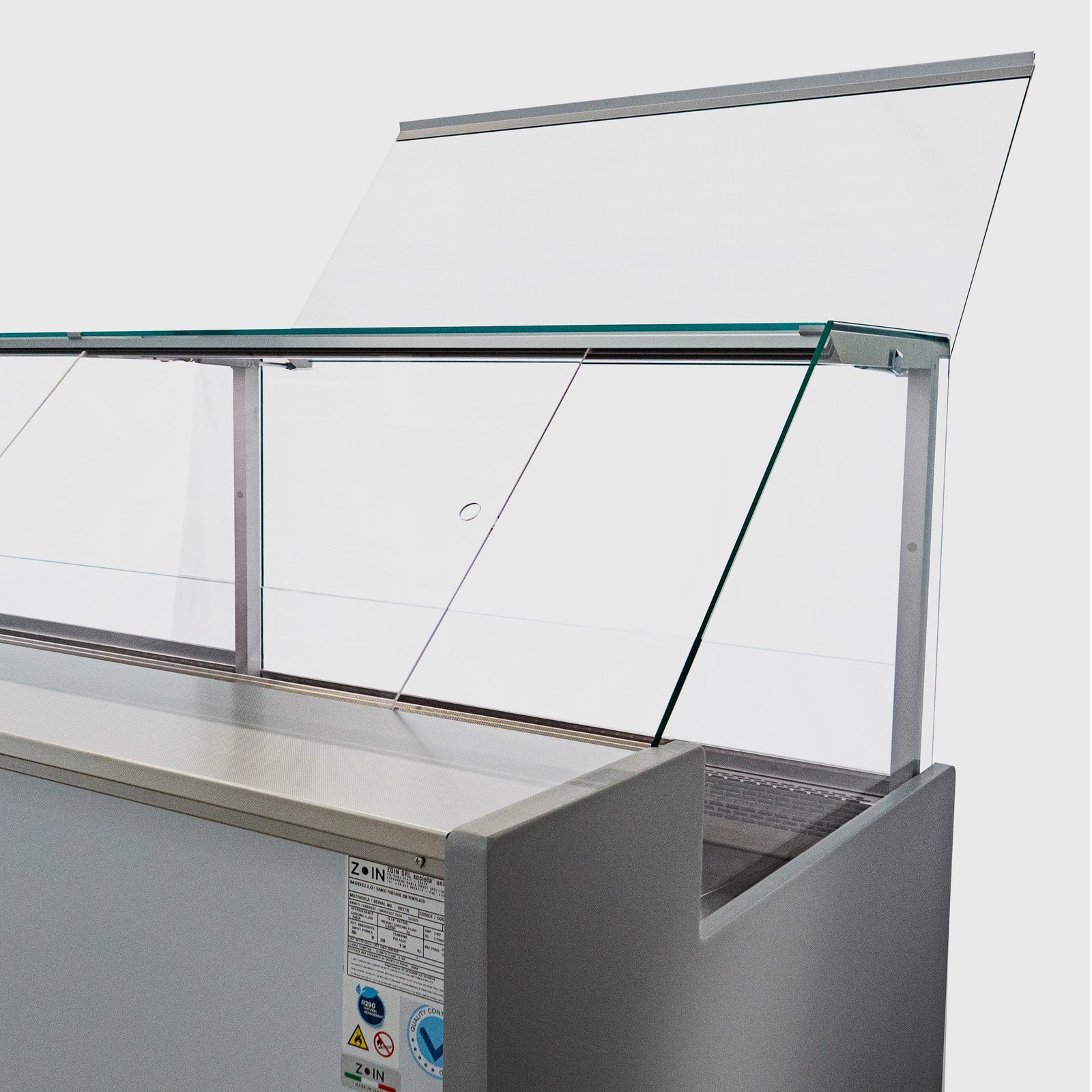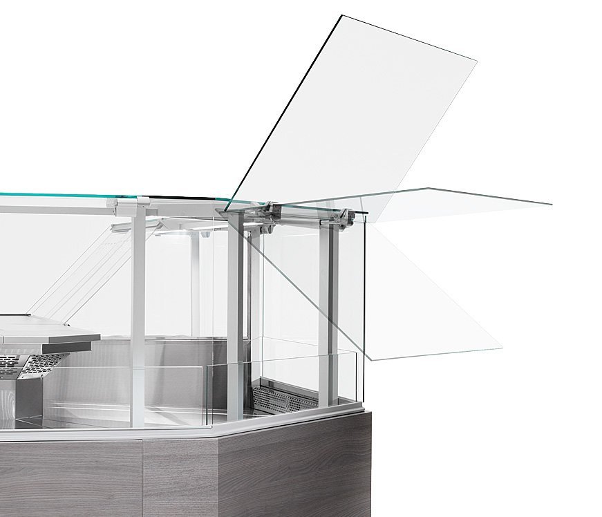 Sklo sa otvára z prednej strany, aby sa uľahčilo vystavovanie tovaru.