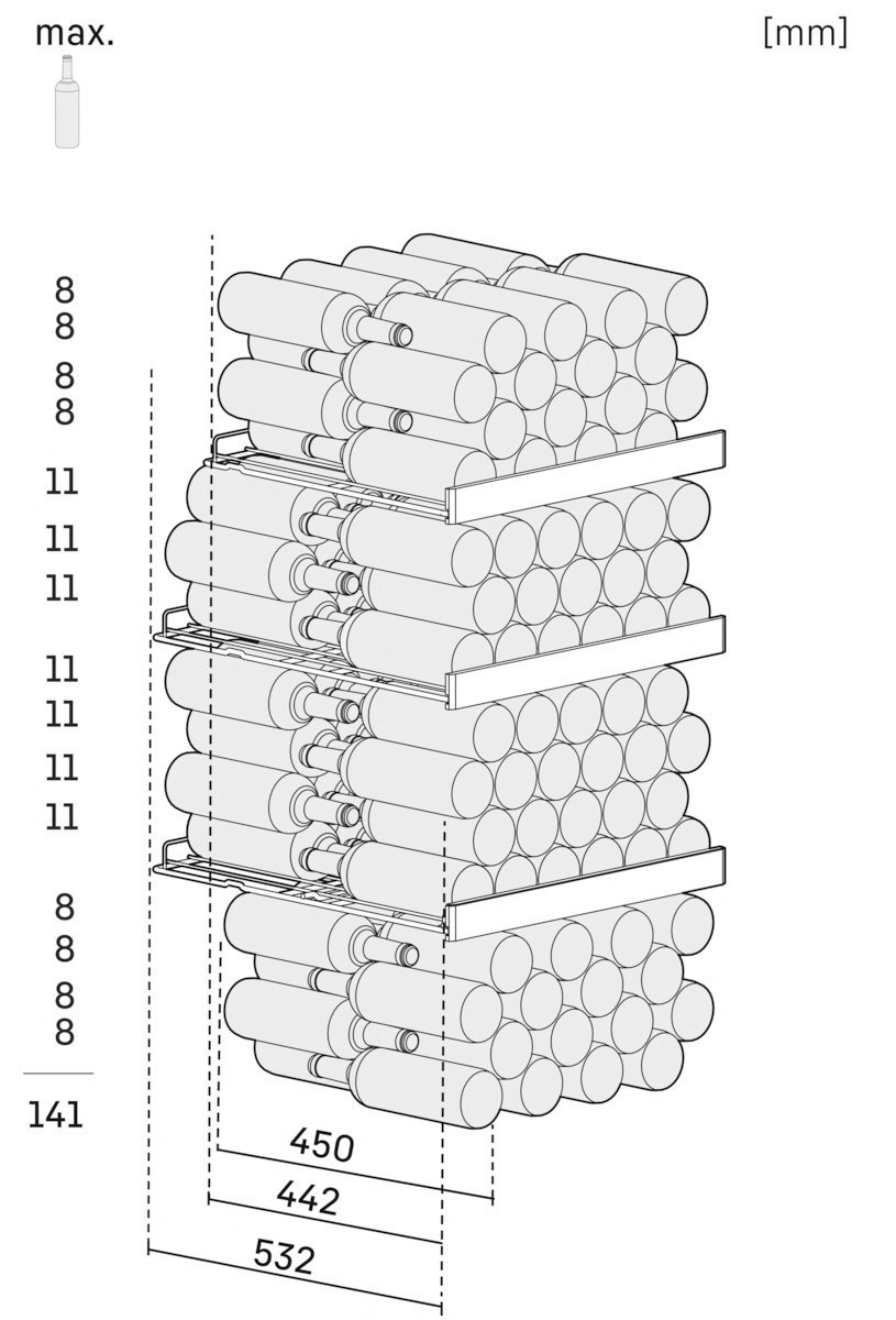Maximálna kapacita. So skladovacou chladničkou na víno Liebherr je uloženie rastúcej zbierky vín hračka. Interiér má navrhnutý tak, že doň môžete na drevené poličky uložiť fľaše hrdlami vedľa seba, čím využijete jeho kapacitu naplno. Vďaka tomu máte vždy dostatok miesta na stále pribúdajúce kúsky. A vy tak môžete pokojne rozširovať svoju zbierku.