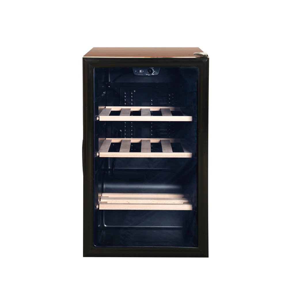 Vinotéka, navrhnutá v súlade s modernými očakávaniami, môže byť skvelým doplnkom do kuchyne, obývačky, pracovne alebo dokonca barov a obchodov. Profesionálny dizajn, sklenené dvierka a drevené police prilákajú uznané pohľady návštevníkov. Teplotu je možné nastaviť v rozmedzí 4 – 18 °C, takže vína sú vždy vychladené na najvhodnejšiu teplotu na 3 drevených policiach. Požadovanú teplotu pre dokonalé chladenie si môžete nastaviť pomocou dotykového panela a LCD displeja. Technológia vetrania a chladenia vzduchom zaisťuje rovnomerné rozloženie teploty. Kompresor pracuje ticho a bez vibrácií. Vzhľad vinotéky je veľmi elegantný: so sklenenými dvierkami a bielym LED vnútorným osvetlením bude hodnou ozdobou vášho domova alebo firemných priestorov. Tónované sklenené dvierka sú nielen krásne, ale slúžia aj praktickým účelom: fungujú aj ako UV filter. UV svetlo môže zmeniť chemické zloženie vína, čo môže ovplyvniť chuť a fázu zrenia. Vďaka tónovaným skleneným dvierkam sú fľaše jasne viditeľné, no zároveň chránené pred škodlivým žiarením.