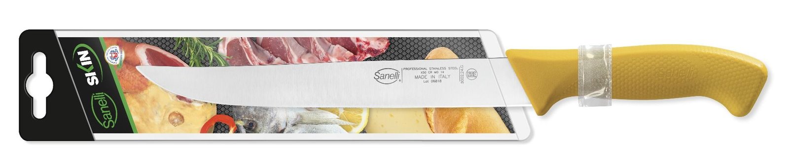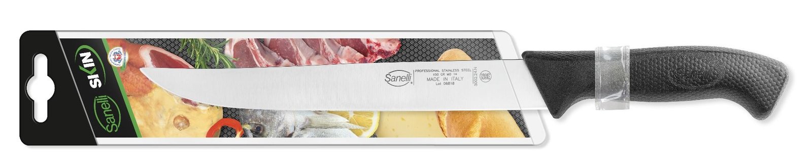 Nová línia Skin kombinuje osvedčenú vysokú kvalitu čepelí Sanelli s úplne novou rukoväťou. Pomocou inovatívnej technológie “texturovania” sa povrch rukoväte SKIN líši od akéhokoľvek iného a zabezpečuje pevný a pohodlný úchop, eliminuje pocit stuhnutosti. Ergonomický tvar je zárukou bezpečnosti. Použitý materiál spĺňa prísne hygienické a potravinárske predpisy. Kompletná línia nožov, ktorá vďaka vynikajúcemu pomeru kvality a ceny je ideálna pre akýkoľvek typ kuchyne, profesionálnej alebo domácej.