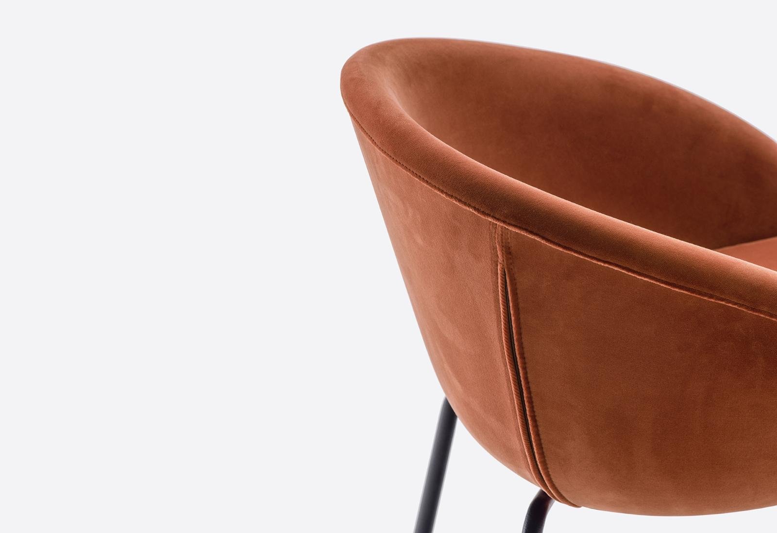 Čalúnené kreslo je k dispozícii s poťahom z látky alebo imitácie kože a je vybavené odnímateľným vankúšom pre maximálny komfort. Jeho stabilitu zabezpečuje oceľový rám s priemerom 16 mm, ktorý zaručuje dlhú životnosť a moderný vzhľad.
