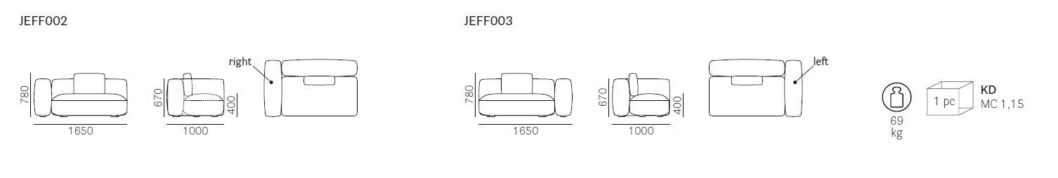 Jeff vyniká čistými líniami a minimalistickým vzhľadom, ktorý je ideálny pre moderné obytné aj komerčné priestory. Sedačka s pravou opierkou je vyrobená z vysoko komfortnej a nedeformovateľnej polyuretánovej peny, ktorá zabezpečuje dlhodobú odolnosť. Textilný poťah, umiestnený na platforme z preglejky, je vyvýšený 3 cm nad podlahou malými nožičkami, čo dodáva sedačke ľahkosť a sofistikovaný vzhľad.