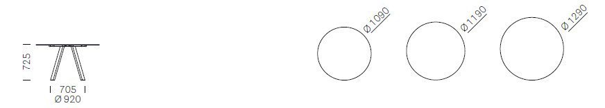 - Rozmery: dostupný v rôznych priemeroch (od Ø800 mm až po Ø1290 mm) a výške 725 mm, čo umožňuje prispôsobiť stôl priestoru aj počtu osôb.