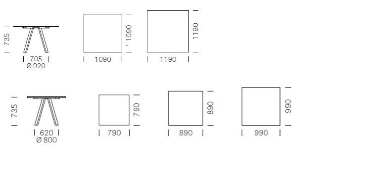 Štvorcové dosky: 790 × 790 mm, 890 × 890 mm, 990 × 990 mm, 1090 × 1090 mm, 1190 × 1190 mm