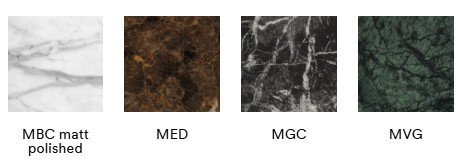 - Materiály: hliníkový rám, doska z mramoru, kompozitného mramoru, Fenix laminátu alebo pevného laminátu