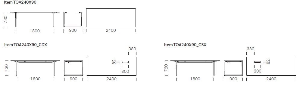 Toa je dostupný v rôznych rozmeroch a povrchových úpravách, vrátane modelov so stredovým alebo bočným systémom vedenia káblov (CDX / CSX) v červenej práškovo lakovanej farbe (RO400) s krytkou z rovnakého materiálu ako je vrchná doska. Stôl je ideálny do „ľahkých“ kancelárií, manažérskych priestorov aj moderných domácich pracovísk.