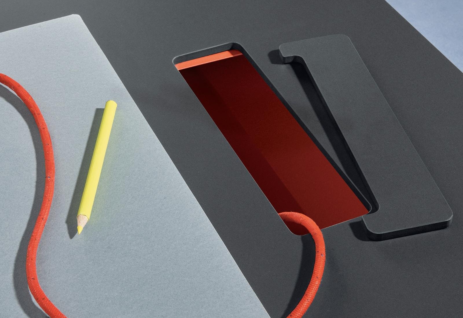 • Káblový manažment: CDX / CSX – otvor s červenou (RO400) práškovo lakovanou lištou a krytkou z rovnakého materiálu ako doska
