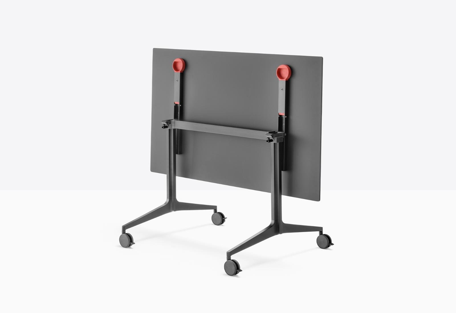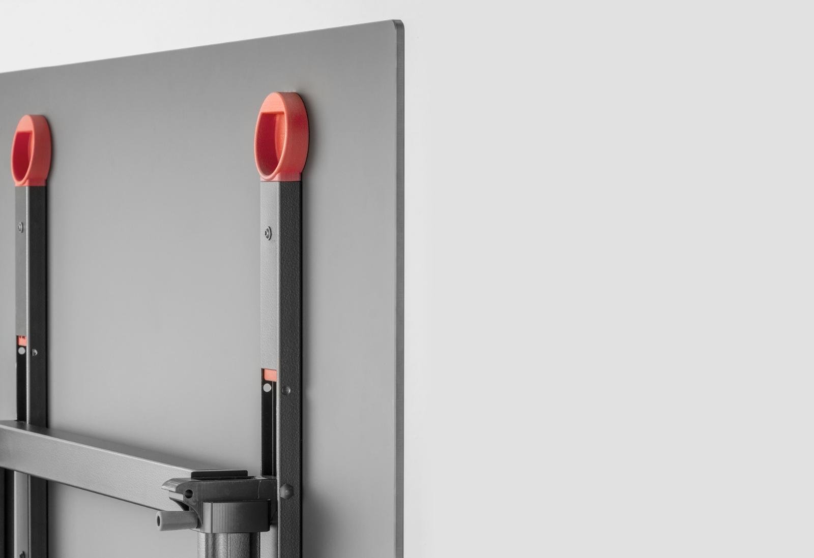 Stôl má patentovaný mechanizmus, ktorý umožňuje jednoduché sklopenie dosky z vodorovnej do zvislej polohy. Táto funkcia uľahčuje skladovanie aj presúvanie, pretože vďaka kolieskam sa dá ľahko presunúť z miesta na miesto.