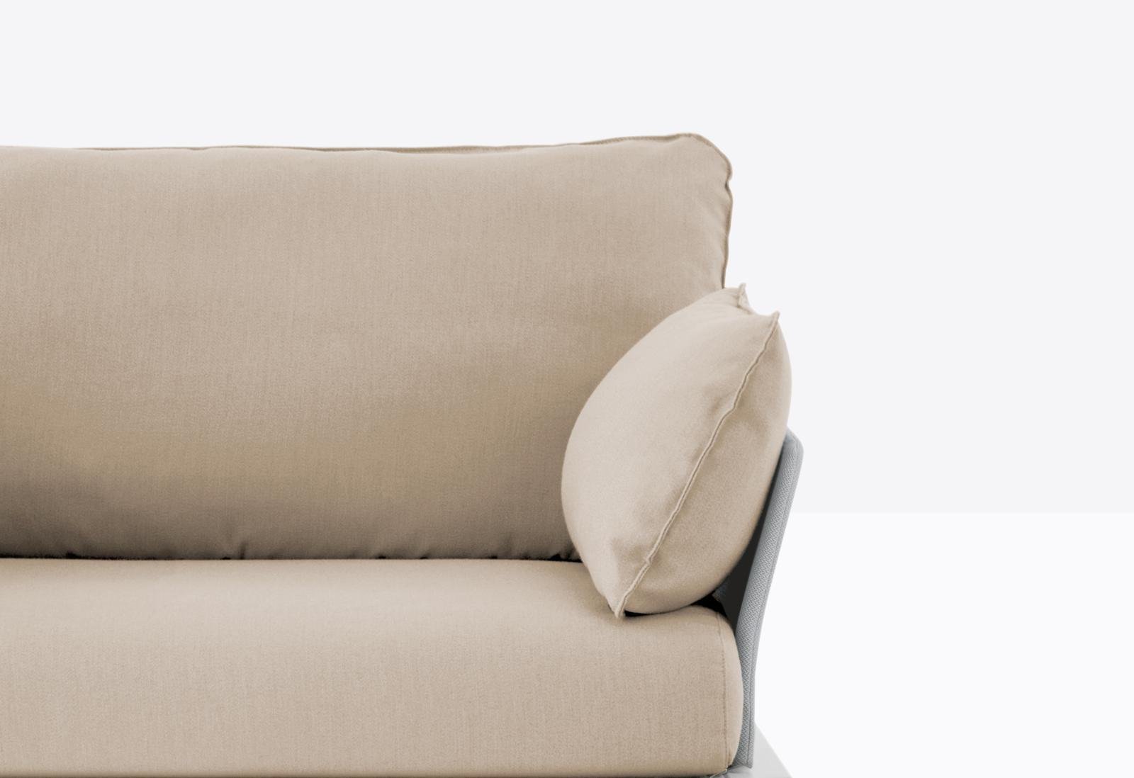 Rám kresla je vyrobený z extrudovaného hliníka a podopretý štyrmi kužeľovitými nohami z tlakovo liateho hliníka. Táto kombinácia zabezpečuje mimoriadnu stabilitu a zároveň podčiarkuje čistotu a jednoduchosť dizajnu. Vankúše sú vyplnené polyuretánovou penou a potiahnuté vodeodolnou textíliou – ideálne pre každé počasie.