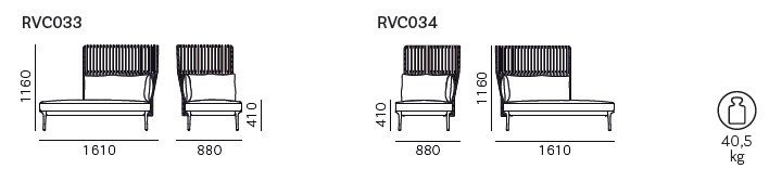RVC033 a RVC034 sa vyznačujú vysokým alebo nízkym operadlom tkaným z odolného polypropylénového lana, ktoré vytvára prirodzený vzhľad a zároveň poskytuje súkromie a vzdušnosť. Každé ležadlo je precízne tvarované pomocou zakrivených línií a elegantne podopreté na štyroch kónických nohách z liateho hliníka.