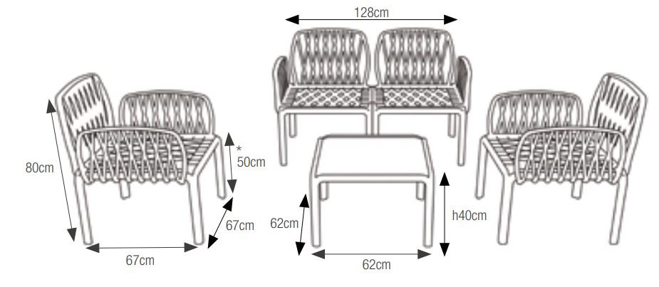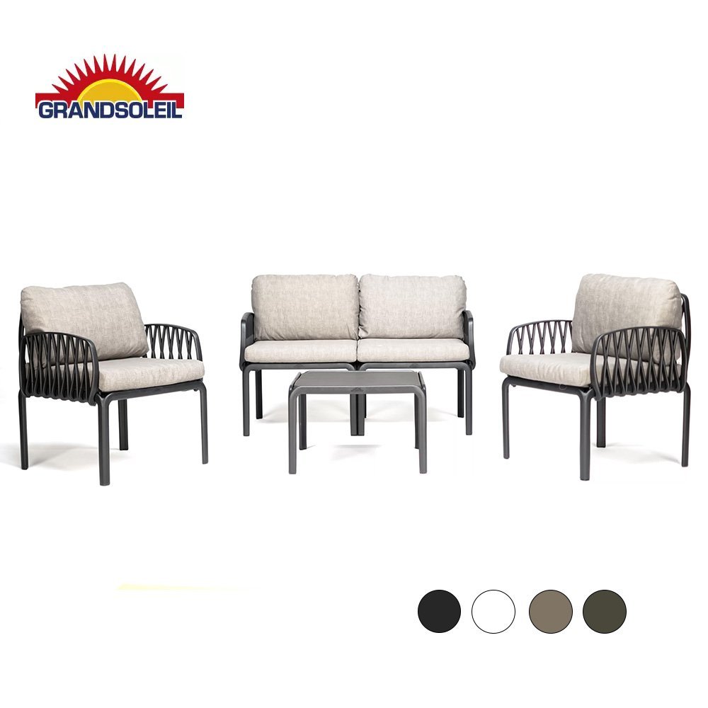 Táto komplexná a praktická sada pozostáva z pohodlného dvojmiestneho gauča, dvoch hlbokých a útulných kresiel a praktického malého stolíka. Rámy týchto elegantných doplnkov do exteriéru sú vyrobené z polypropylénu a sklolaminátu. Pre maximálne pohodlie sú súčasťou sady štyri krásne sedacie vankúše a štyri vankúše na chrbát z vodeodolného polybavlny.