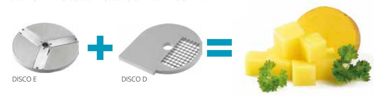Kombináciou diskov D8 x 8 – D10 x 10 – D12 x 12 – D20 x 20 – K8x8 – K10x10 – K12x12 – K20x20 s diskami E6 – E8 – E10 – E14 získate veľké množstvo rôznych typov kociek pre minestrone a ovocné šaláty.