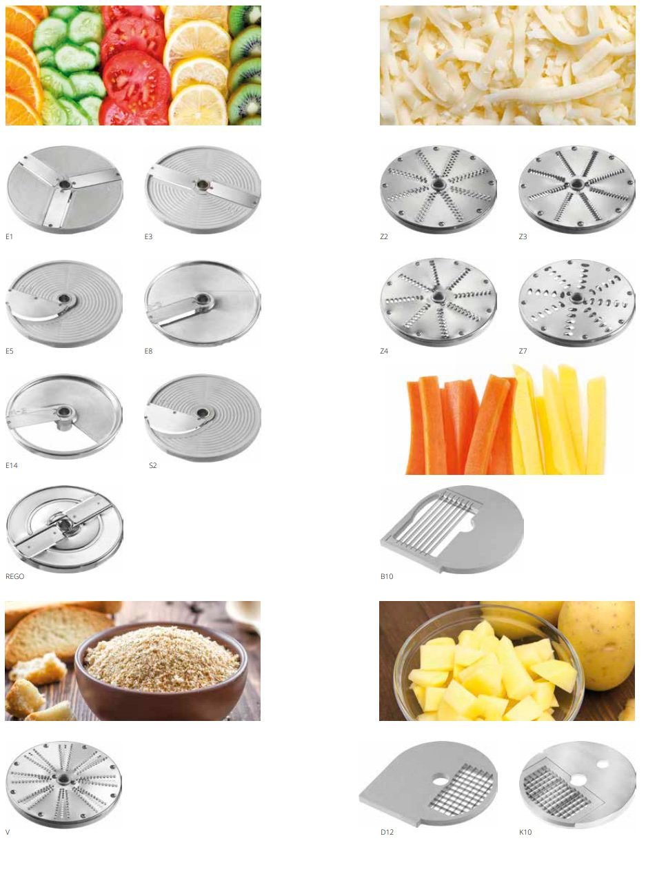 H2.5 – H4 – H6 – H8 – H10: zeler, cukety, cvikla, reďkovky, zemiaky a reďkovka. Kombináciou diskov B6 – B8 – B10 s diskami E6 – E8 – E10 je možné získať julienne po celej dĺžke produktu s požadovanou hrúbkou.