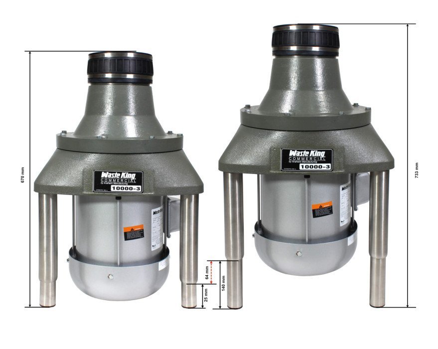 Gastro drvička Waste King 10000 je samostojná, stojí na troch výškovo nastaviteľných nôžkach. Napojenie na drez je z materiálu, ktorý tlmí vibrácie a hluk vznikajúci pri drvení. Drvič je možné ovládať pomocou pneumatického či kolískového spínača v závislosti na inštalácii.