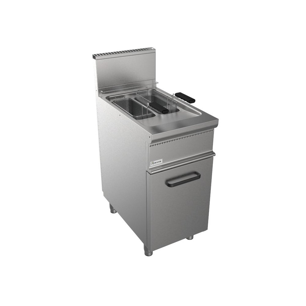 Nádrže z nehrdzavejúcej ocele AISI 304 s objemom 8,0 l, hrúbka 1,5 mm, lisované v jednom kuse, so zaoblenými hranami. Horný stôl je lisovaný a vybavený veľkou, zaoblenou misou, aby sa vytvorila široká oblasť expanzie oleja, aby sa zabránilo akémukoľvek pretečeniu oleja počas varenia a manipulácie s košíkom. Kohútik na vypúšťanie oleja je z chromátovej mosadze. Olej sa vypúšťa do oceľovej misky vybavenej filtrom z nehrdzavejúcej ocele. Ohrev sa uskutočňuje pomocou plameňových rúrok umiestnených vo vnútri nádrže s vnútornými rebrami pre lepšiu výmenu tepla. Teplo produkujú horáky s vysokou tepelnou účinnosťou, vynikajúcou produktivitou a zníženou spotrebou. Mechanický ventil a bezpečnostný termočlánok, ktoré zaručujú merný výkon cca 1,0 kW na liter oleja, umožňujú rýchly nárast teploty samotného oleja pri zaťažení agregátu. Piezoelektrické zapaľovanie kontrolky s nezávislou batériou. Teplota kuchynského oleja je riadená ventilom prívodu plynu k horákom tak, aby sa získala okamžitá reakcia na pokles teploty v dôsledku zavedenia náplne. Maximálna pracovná teplota je nastavená na 190°C a bezpečnostný termostat preruší tok plynu v prípade poruchy, pri ktorej by teplota oleja prekročila 230°C. Žiarovky pracovného aj bezpečnostného termostatu sú upevnené v nádrži a starostlivo chránené pred náhodnými nárazmi. Oceľové dvere s magnetickým zatváraním. Nastaviteľné nohy z nehrdzavejúcej ocele AISI 304.