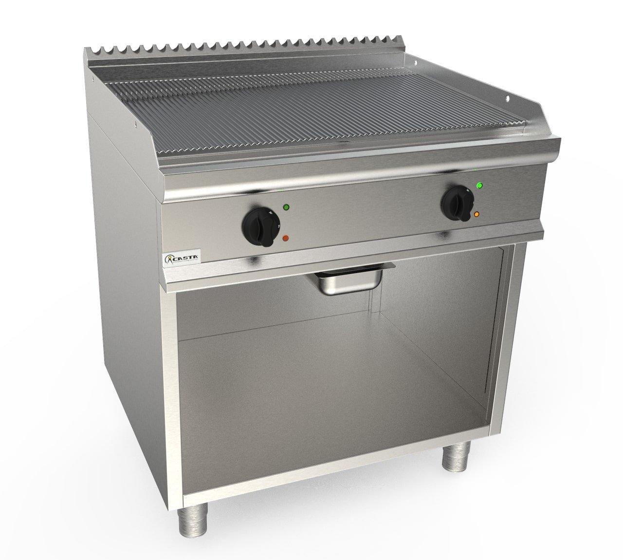 Celé z AISI 304 18/10 nehrdzavejúcej ocele škótskej brite. Zaoblená pracovná plocha z nehrdzavejúcej ocele AISI 304 so zadným komínom. Svetlá a tvrdochrómová varná doska, hrúbka 15 mm: drážkovaná. Ochranné kryty z nehrdzavejúcej ocele AISI 304. Predný žľab na tuk s odtokovým otvorom a zásuvkou na zachytávanie tuku. Výkon riadený spínacím termostatom; termostat od 100°C do 270°C pre pracovnú teplotu a bezpečnostný termostat s manuálnym resetom. Chladivé rukoväte a gombíky vyrobené z tepelne odolného materiálu. Nastaviteľné nohy z nehrdzavejúcej ocele AISI 304 18/10.