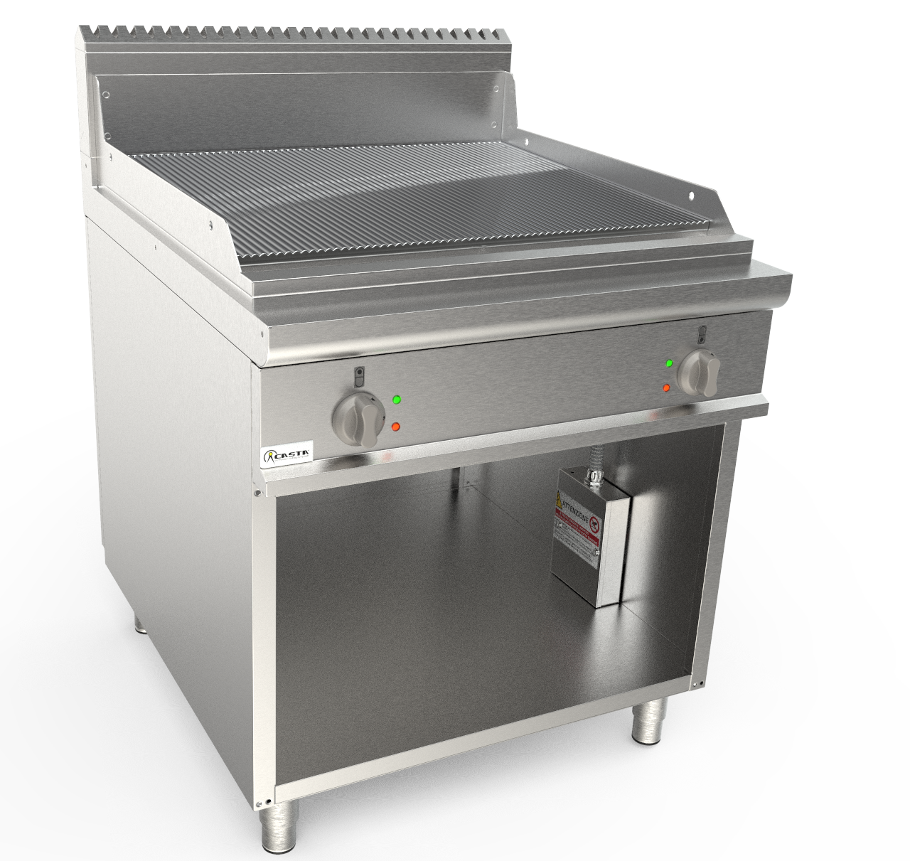 Celá konštrukcia je vyrobená z nehrdzavejúcej ocele AISI 304 18/10. Zaoblená pracovná doska z nehrdzavejúcej ocele AISI 304 so zabudovaným potrubím na odvod pár. 15 mm chrómová varná doska, drážkovaná. Ochrana proti striekajúcej vode z nehrdzavejúcej ocele AISI 304. Podnos s odtokovým otvorom a zásuvkou na zachytávanie tuku. Výkon ovládaný spínačom termostatu; termostat od 100°C do 270°C pre pracovnú teplotu a bezpečnostný termostat s manuálnym resetom. Ovládacie prvky a rukoväte vyrobené z tepelne odolného materiálu. Nastaviteľné nohy z nehrdzavejúcej ocele AISI 304 18/10.