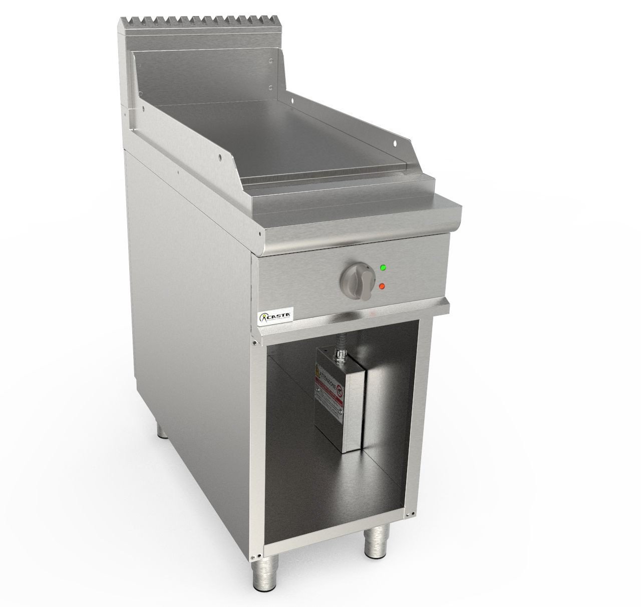 Celé z nehrdzavejúcej ocele AISI 304 škótskeho britu. Zaoblená pracovná plocha z nehrdzavejúcej ocele AISI 304 so zadným komínom. Šírka plechu 15,0 mm: hladká. Ochranné kryty z nehrdzavejúcej ocele AISI 304. Predný žľab na mazanie s otvorom a GN 1/3 65h mm umiestnený v otvorenom stojane na zber oleja a tuku. Výkon riadený spínacím termostatom; termostat od 100°C do 240°C pre pracovnú teplotu a bezpečnostný termostat s manuálnym resetom. Chladivé rukoväte a gombíky vyrobené z tepelne odolného materiálu. Nastaviteľné nohy z nehrdzavejúcej ocele AISI 304.