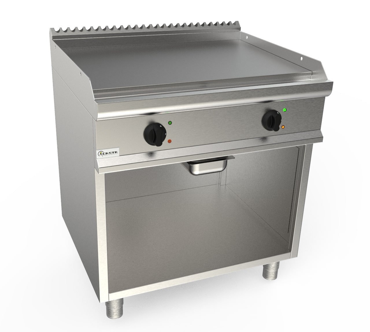 Celé z AISI 304 18/10 nehrdzavejúcej ocele škótskej brite. Zaoblená pracovná plocha z nehrdzavejúcej ocele AISI 304 so zadným komínom. Varná doska zo svetlého a tvrdého chrómu, hrúbka 15 mm: hladká. Ochranné kryty z nehrdzavejúcej ocele AISI 304. Predný žľab na tuk s odtokovým otvorom a zásuvkou na zachytávanie tuku. Výkon riadený spínacím termostatom; termostat od 100°C do 270°C pre pracovnú teplotu a bezpečnostný termostat s manuálnym resetom. Chladivé rukoväte a gombíky vyrobené z tepelne odolného materiálu. Nastaviteľné nohy z nehrdzavejúcej ocele AISI 304 18/10.