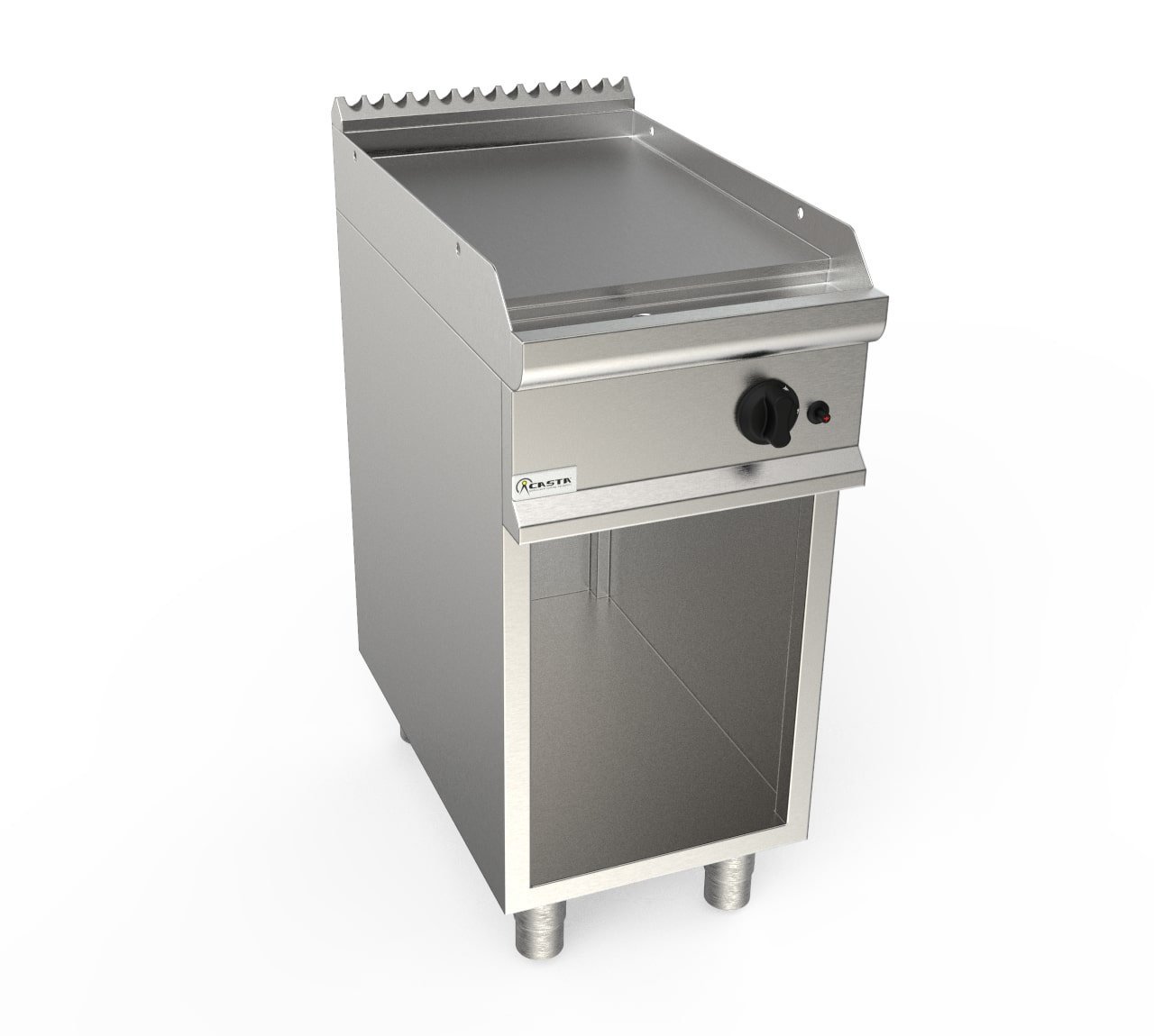 Celé z nehrdzavejúcej ocele AISI 304 škótskeho britu. Varná doska zo svetlého a tvrdého chrómu, hrúbka 15 mm: hladká. Ochranné kryty z nehrdzavejúcej ocele AISI 304. Predný žľab na mazanie s GN 1/3 umiestnený v spodnej priehradke na zachytávanie oleja a tukov. Vysokoúčinné plynové horáky s dvoma plameňovými trubicami: č. 1 varná plocha v modeli 400 mm. Regulácia teploty termostatickým kohútikom 0-8 polôh, termočlánkom a piezoelektrickým zapaľovaním. Gombíky a rukoväte z atermického materiálu AISI 304 nerezové nastaviteľné nohy.
