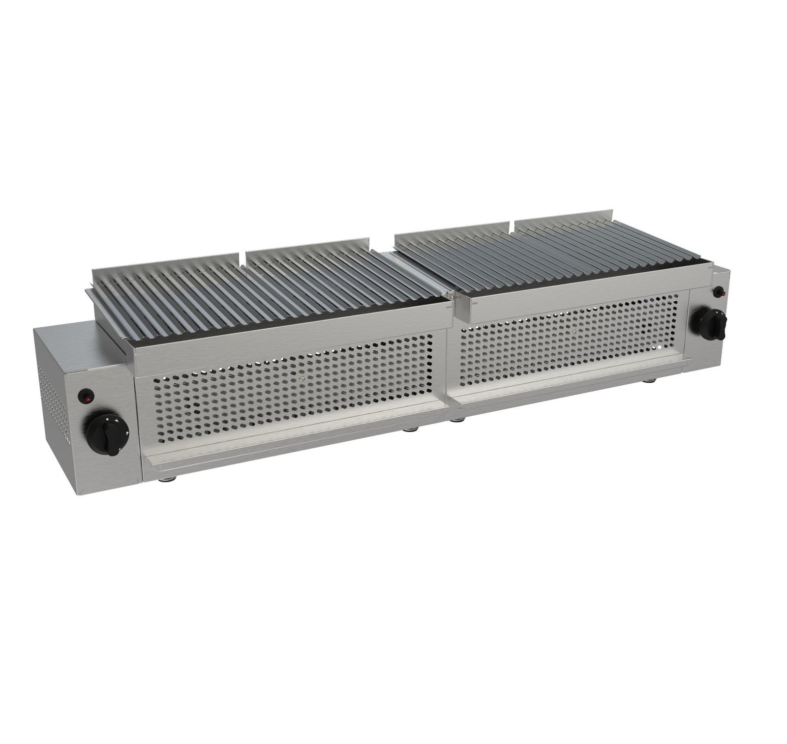 Celé z nehrdzavejúcej ocele AISI 304. Nerezové mriežky s tvarom „V“ na odtok tuku a oceľová okrúhla mriežka na varenie rýb (na požiadanie). Vysokoúčinný plynový horák s plynovým bezpečnostným kohútikom, termočlánkom, piezoelektrickým zapaľovaním a nastavením teploty min./max. Odnímateľná predná lišta na zachytávanie tuku a oleja. Odnímateľná odkvapkávacia nádoba pod horákom. Chladivá rukoväť a gombík vyrobené z tepelne odolného materiálu.