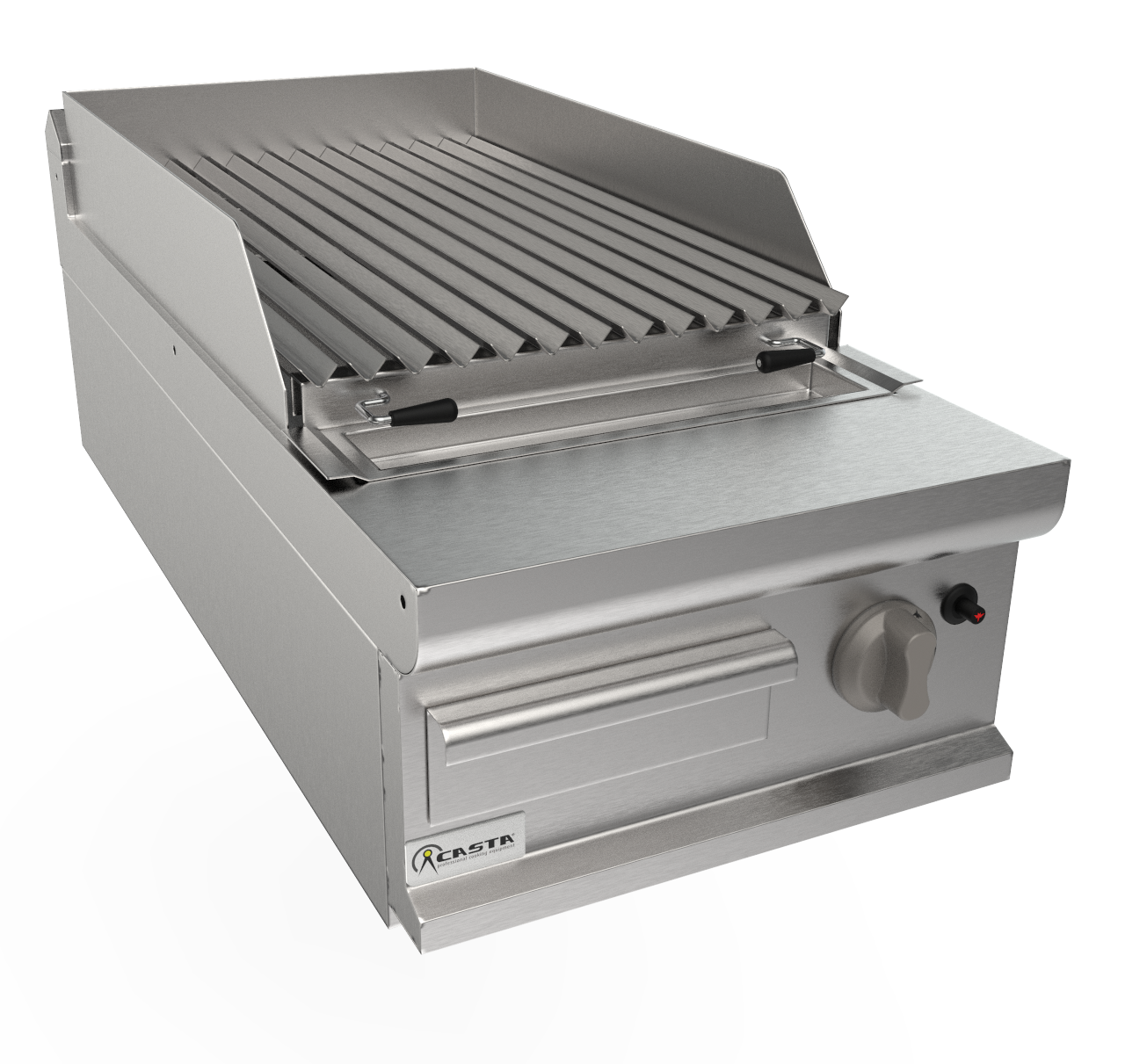 Zaoblený horný povrch z nehrdzavejúcej ocele AISI 304. Nerezová mriežka s tvarom „V“ na odvod tuku. Mriežka na varenie rýb z oceľovej tyče (na požiadanie). Predný žľab na tuk s odtokovým otvorom a vyberateľnou zásuvkou na zachytávanie tuku. Vysokoúčinné plynové horáky s dvomi plameňovými trubicami, plynovou poistkou, termočlánkom, piezoelektrickým zapaľovaním a nastavením teploty min./max. Cool-grip gombíky vyrobené z tepelne odolného materiálu. Nastaviteľné nohy z nehrdzavejúcej ocele AISI 304 18/10. Certifikované podľa noriem ES.