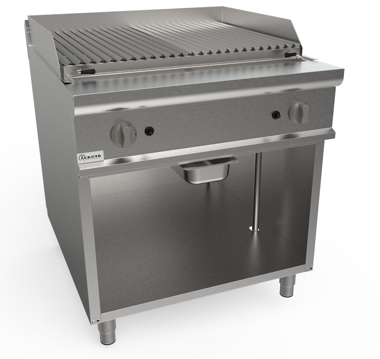 Zaoblený horný povrch z nehrdzavejúcej ocele AISI 304. Nerezová mriežka s tvarom „V“ na odvod tuku. Mriežka na varenie rýb z oceľovej tyče (na požiadanie). Predný žľab na tuk s odtokovým otvorom a vyberateľnou zásuvkou na zachytávanie tuku. Vysokoúčinné plynové horáky s dvomi plameňovými trubicami, plynovou poistkou, termočlánkom, piezoelektrickým zapaľovaním a nastavením teploty min./max. Cool-grip gombíky vyrobené z tepelne odolného materiálu. Nastaviteľné nohy z nehrdzavejúcej ocele AISI 304 18/10. Certifikované podľa noriem ES.