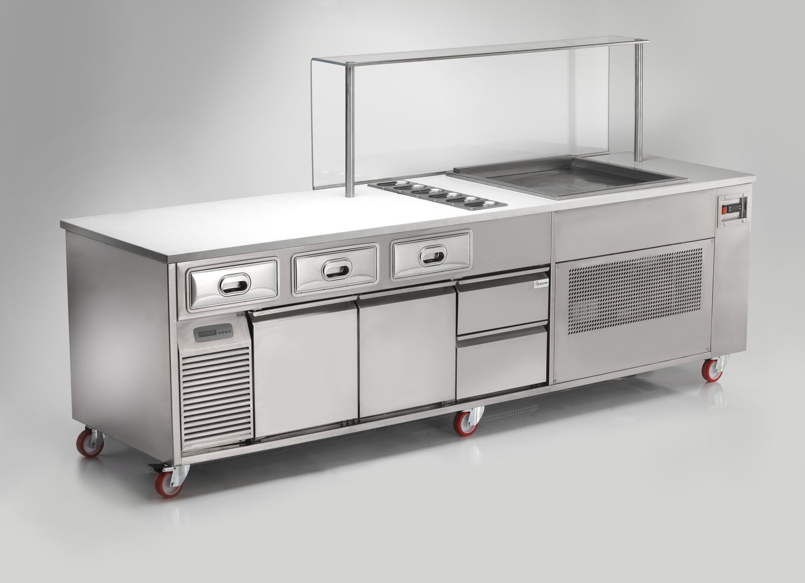 TEPP-ICE je nový, inovatívny koncept, ktorý dokáže premeniť jednoduchú remeselnú zmrzlinu na skutočný chutný zážitok. TEPP-ICE, navrhnutý špeciálne pre všetkých profesionálov v sektore zmrzliny, cateringu a street-food jedla, predstavuje novú hranicu chuti. Vďaka špeciálnej chladiacej doske, ktorá dosahuje -38 °C, sa príprava zmrzliny stáva kreatívnym zážitkom: Zmrzlinové rolky, studené dezerty, palacinky, krémové zmrzliny, granity, sorbety, koktaily, instantné čokoládové ozdoby, slané recepty na ryby a umelecké výtvory sú len niektoré z rýchlych receptov, ktorými môžete ohromiť a nadchnúť. Jediným limitom je vaša predstavivosť! Samostatný mobilný ostrov na kolieskach, s odpultovými chladiacimi priestormi, s pracovnou doskou a hygienickým zákrytom z plexiskla, vhodné na show-cooking. Vyrobené z nehrdzavejúcej ocele AISI 304, ovládací panel s predprogramovaným zapaľovaním, tropikalizovaný kompresor.