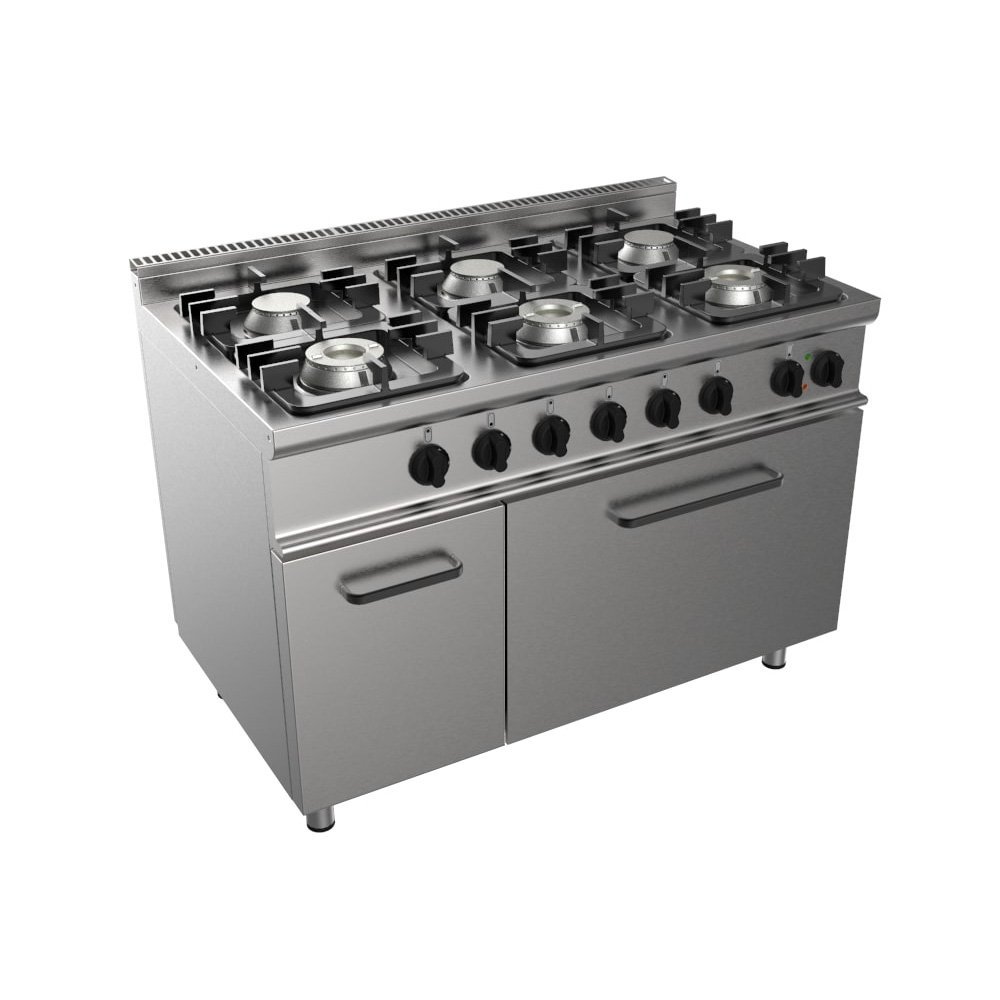 Pracovná doska z nehrdzavejúcej ocele AISI 304 18/10 s potlačou s vybraním na zber štiav, hĺbka 22 mm. Pochrómované liatinové otvorené horáky – dvojité s výkonom 7,5 kW a jednoduché s výkonom 4,5 kW – s termočlánkom a chráneným zapaľovacím plameňom. Manuálne zapaľovanie. Svetlá porcelánová smaltovaná liatina a kyselinovzdorná mriežka pre jeden horný horák. Rúra elektrická statická GN 2/1 mm.685X530Xh350 s č. 2 plášťové rezistory (dolný a horný) ovládané č. 2 nezávislé termostaty, regulácia teploty od 0° do 300° C. Komora z nehrdzavejúcej ocele AISI 430. Dvierka rúry a vnútorné dvierka z nehrdzavejúcej ocele 430. Tesnenie dvierok rúry. Chladivé rukoväte a gombíky vyrobené z tepelne odolného materiálu. Nastaviteľné nohy z nehrdzavejúcej ocele AISI 304 18/10. Certifikované podľa noriem ES.