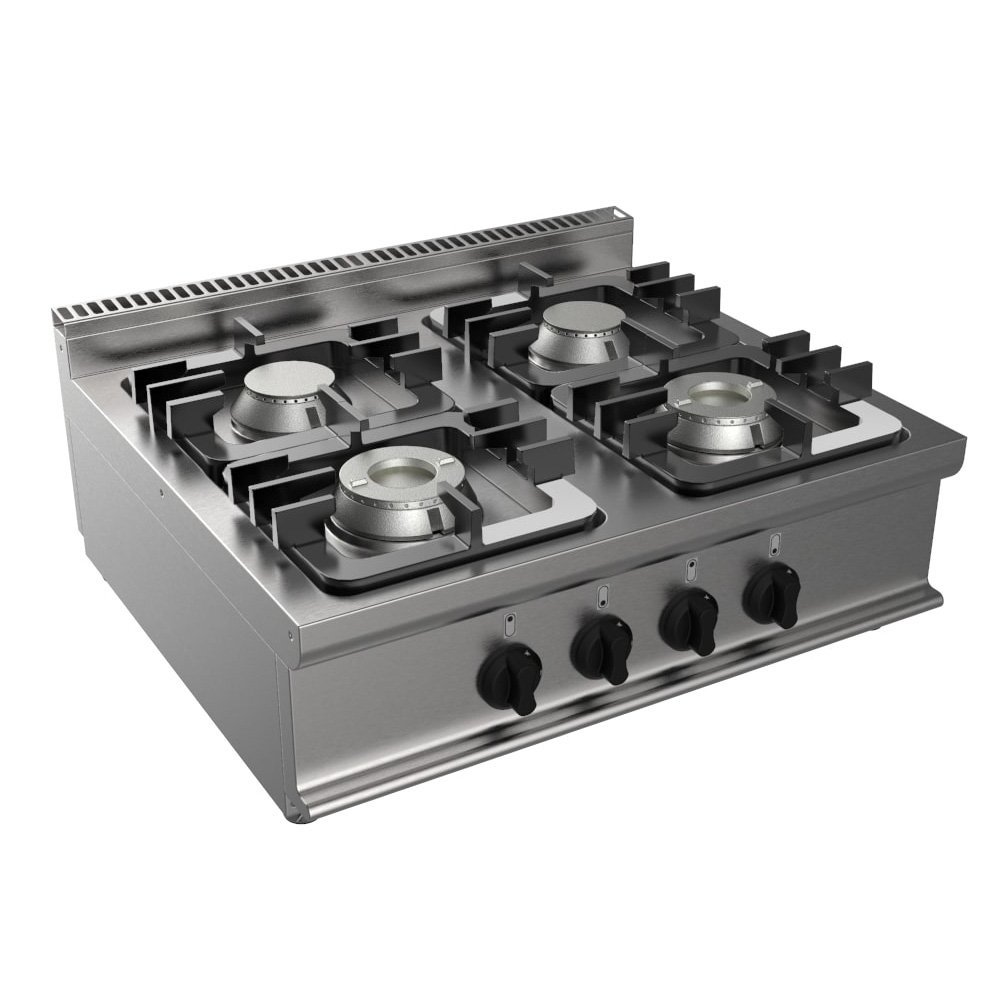 Pracovná doska z nehrdzavejúcej ocele AISI 304 18/10 s potlačou s vybraním na zber štiav, hĺbka 22 mm. Pochrómované liatinové otvorené horáky – dvojité s výkonom 7,5 kW a jednoduché s výkonom 4,5 kW – s termočlánkom a chráneným zapaľovacím plameňom. Manuálne zapaľovanie. Svetlá porcelánová smaltovaná liatina a kyselinovzdorná mriežka pre jeden horný horák. Chladivé rukoväte a gombíky vyrobené z tepelne odolného materiálu. Nastaviteľné nohy z nehrdzavejúcej ocele AISI 304 18/10. Certifikované podľa noriem ES.