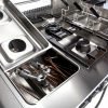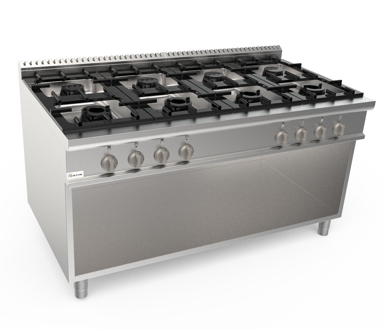Celonerezové prevedenie z oceli AISI 304 18/10. Pracovná doska z nehrdzavejúcej ocele s potlačou na zber štiav, hĺbka 22 mm. Otvorené horáky z chrómovanej liatiny – dvojité korunky s výkonom 7,5 kW a jednoduché korunky s výkonom 3,5 kW a 5,5 kW– s termočlánkom. Manuálne zapaľovanie. Smaltované liatinové rošty horákov s porcelánovým povrchom, odolné voči kyselinám. Madlo a gombíky vyrobené z tepelne odolného materiálu. Nastaviteľné nohy z nerezovej ocele AISI 304 18/10. Certifikované podľa noriem CE.