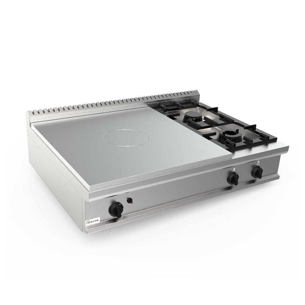 Celonerezové prevedenie z oceli AISI 304 18/10. Oceľová varná doska, hrúbka 12,0 mm s odnímateľnou stredovou časťou pre lepšie čistenie a údržbu. Atmosférický horák s výkonom 4,5 kW a s piezoelektrickým zapaľovaním. Otvorené horáky z chrómovanej liatiny – dvojité korunky s výkonom 7,5 kW a jednoduché korunky s výkonom 4,5 kW – s termočlánkom a pilotným plameňom. Manuálne zapaľovanie.
