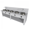 Model na otvorenom stojane. Varná doska vyrobená z nehrdzavejúcej ocele AISI 304 18/10 (hrúbka 2,5 mm), vystužená zváranými rúrkami. Znížená varná doska s bežcom a s automatickým čistiacim systémom (rozprašovanie vody). Zadný lem 400 mm. 2 x vodovodný kohútik na zadnej strane 300mm. Odnímateľné odkvapkávacie misky. Nastaviteľné nožičky z nehrdzavejúcej ocele AISI 304 18/10. Atmosférické horáky.
