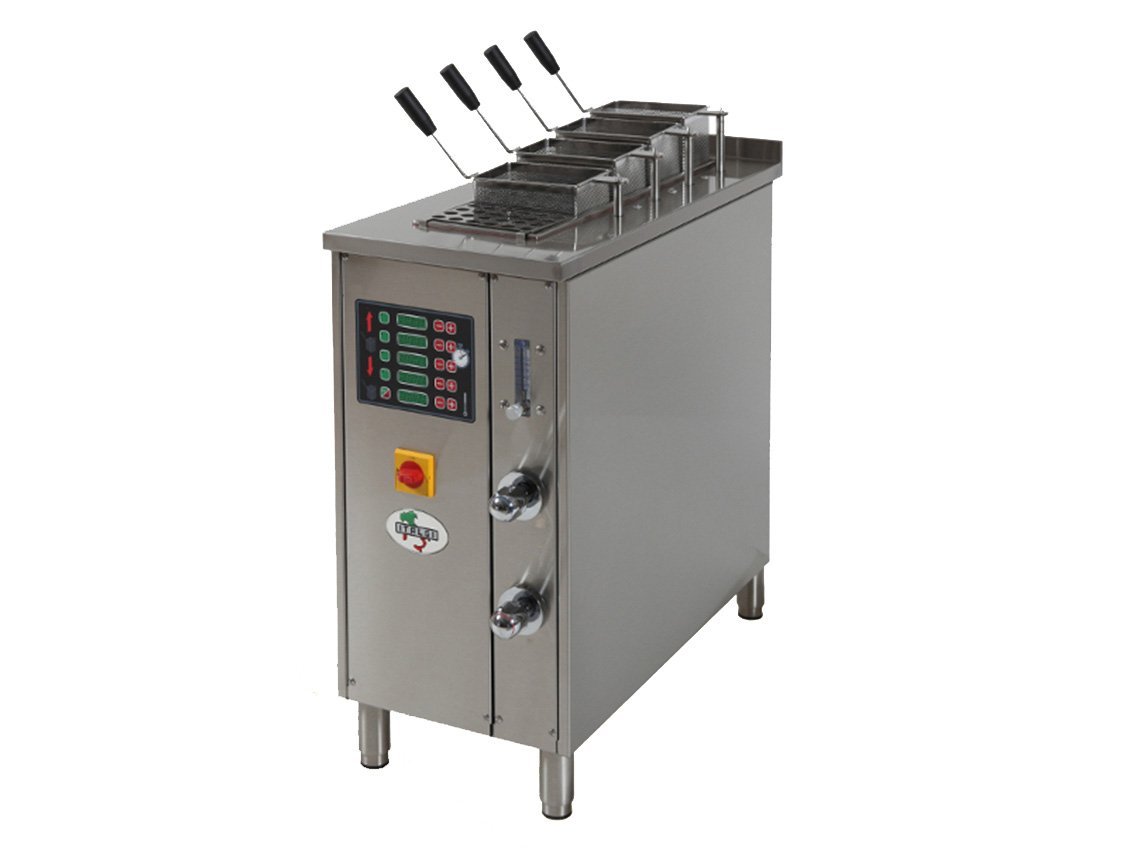 Elektrický varič na cestoviny s prístrojom na automatické zdvíhanie košíkov počas varenia. Čas varenia možno programovať samostatne pre každý košík.