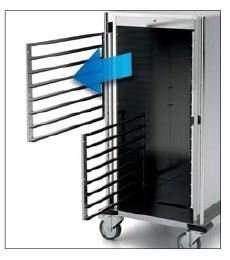 Pohodlný presun zabezpečujú 4 otočné kolieska Ø125 mm, z toho dve s brzdou, spolu s plno výsuvnými madlami po bokoch. Všetky dvierka sú vybavené tepelne odolným tesnením pre minimalizáciu tepelných strát. Ochranné rohy a odnímateľné vnútorné vodiace rámy umožňujú jednoduché čistenie a bezpečnú manipuláciu bez prevrátenia GN nádob.