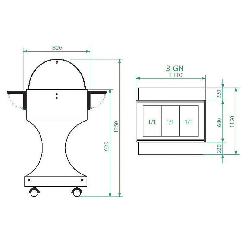Drevené chladiace vozíky s kupolou z plexiskla. Konštrukcia z vrstveného brezového dreva – polkruhová kupola z plexiskla – statické chladenie – modely s dvoma sklopnými policami – multidirekčné kolieska ø 100 mm. Nádoby nie sú zahrnuté – uvedené pracovné teploty sú platné s nasadenými vekoami.