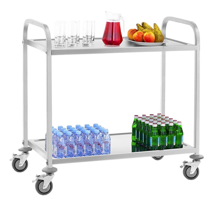 2-poschodový servírovací vozík z nehrdzavejúcej ocele, rozmer 95x50x94 cm, určený na prepravu a servírovanie rôznych jedál a nápojov. Vozík má pevné konštrukcie, ľahko sa čistí, vybavený 4 otočnými kolieskami, z ktorých 2 sú brzdené. Police majú zvýšené okraje, ktoré zabraňujú pádu prepravovaného tovaru. Maximálna nosnosť na jednu policu je 50 kg.