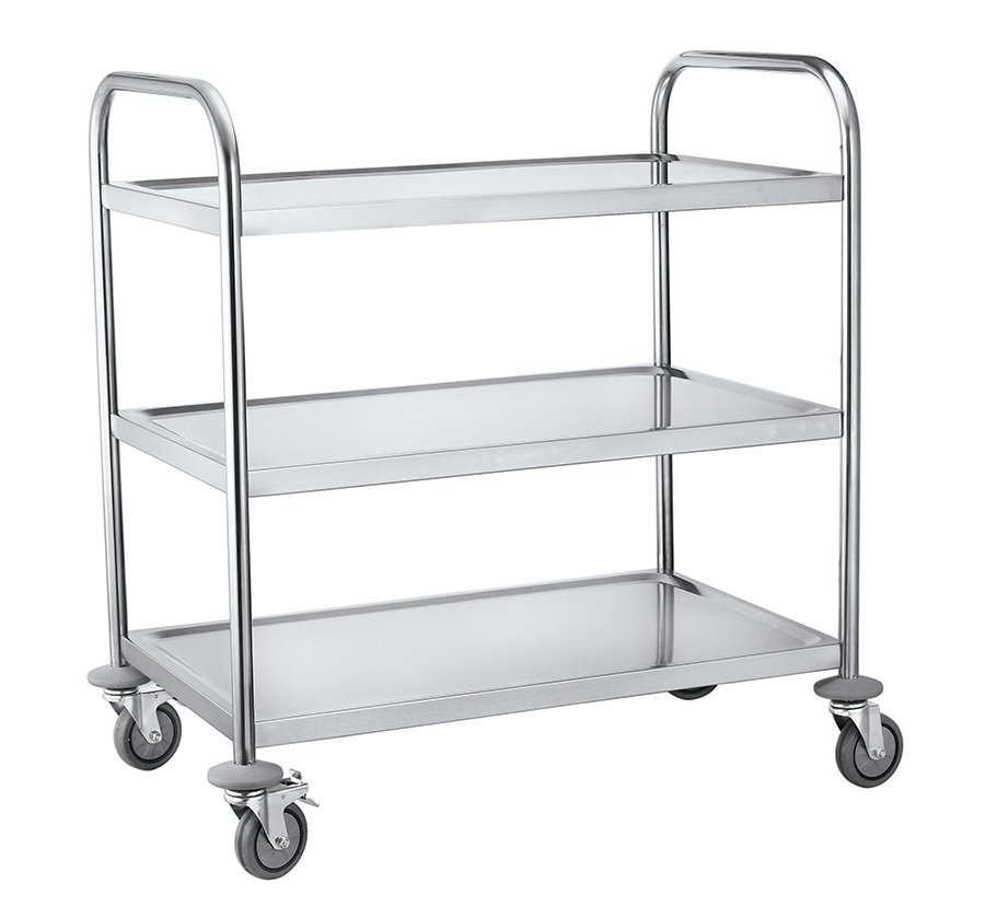 3-poschodový servírovací vozík z nehrdzavejúcej ocele, rozmer 84,5×52,5×94 cm, určený na prepravu a servírovanie rôznych jedál a nápojov. Vozík má pevné konštrukcie, ľahko sa čistí, vybavený 4 otočnými kolieskami, z ktorých 2 sú brzdené. Police majú zvýšené okraje, ktoré zabraňujú pádu prepravovaného tovaru. Maximálna nosnosť na jednu policu je 35 kg.